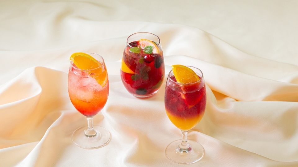 右(赤ワイン)左(白ワイン):長崎みかんの優しい甘酸っぱさをギュッと閉じ込めた飲みやすい柑橘系ワインカクテルです。