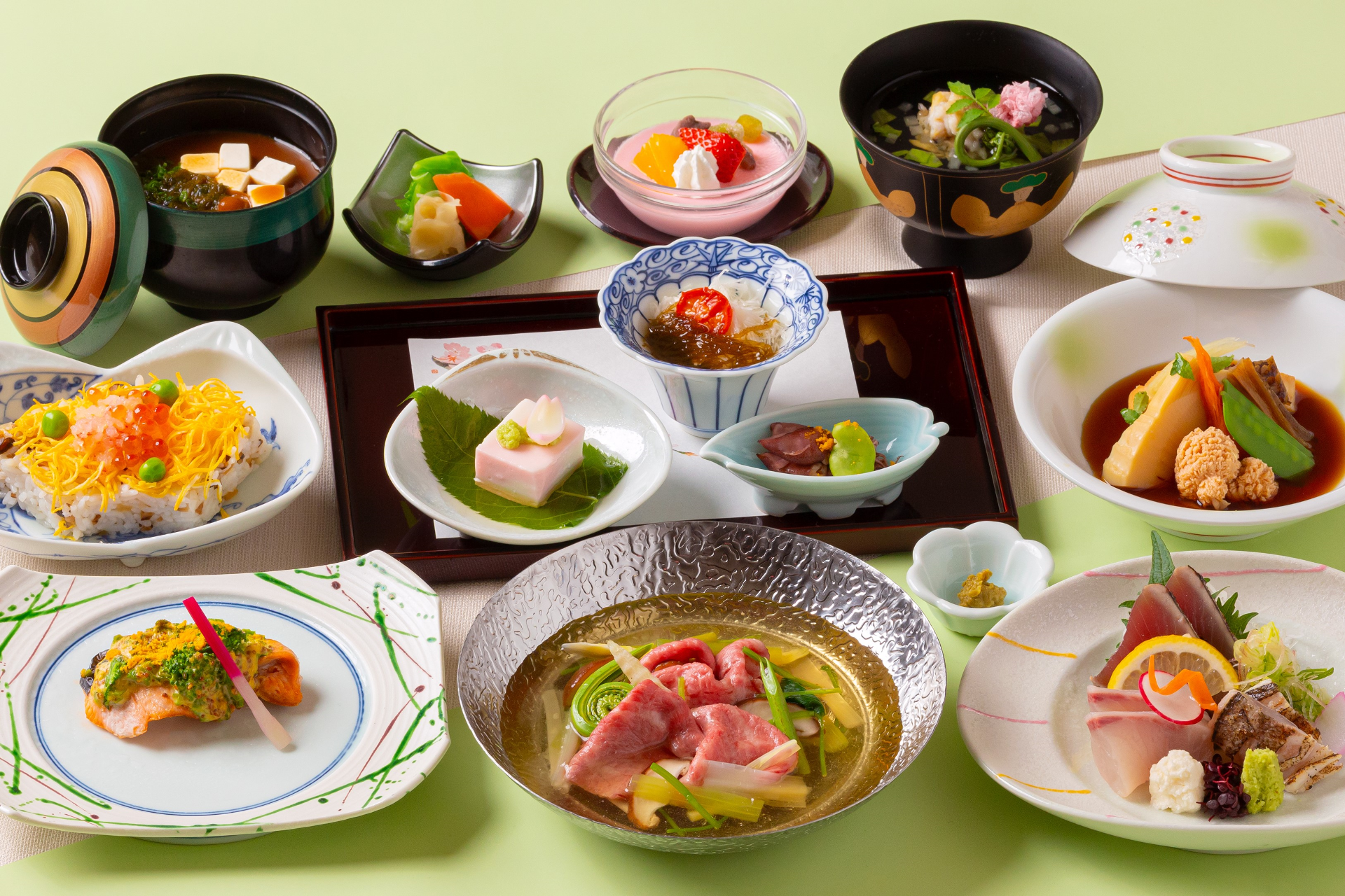 旬の野菜とともに楽しむ「国産牛と春野菜の小鍋仕立て」、桃の節句をイメージした「ちらし寿司」の他、「長崎県産 タイの煮付け」など春の風情と滋味あふれる味わいをご賞味ください。
